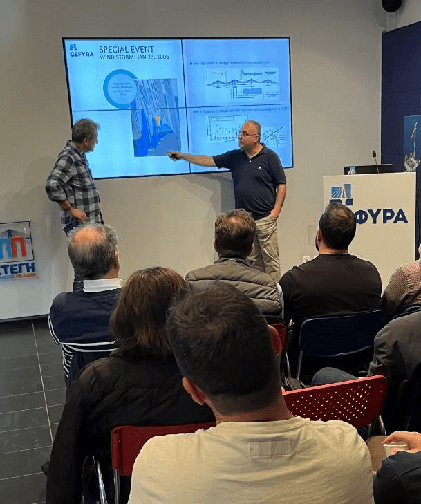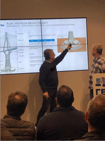 Τεχνική επίσκεψη στον πυλώνα Μ4 όπου παρουσιάστηκε ο σημαντικότερος δομικός εξοπλισμός της γέφυρας (καλώδια σύστημα απόσβεσης, αρμοί καλωδιωτής γέφυρας και γεφυρών πρόσβασης, κατάστρωμα, σύστημα εγκάρσιας στήριξης και απόσβεσης καταστρώματος, Σύστημα Δομικής Παρακολούθησης- SHMS).